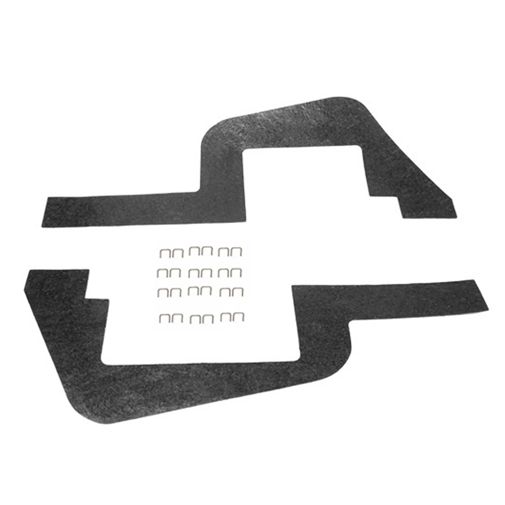 Splash apron / a arm dust shields. Die cut from original style masticated rubber for a factory fit. Pieces fit over a-arms inside front inner fenders. Exact replacement with access cut for brake line on driver side. 2 piece kit, installation staples included. MADE IN THE USA.