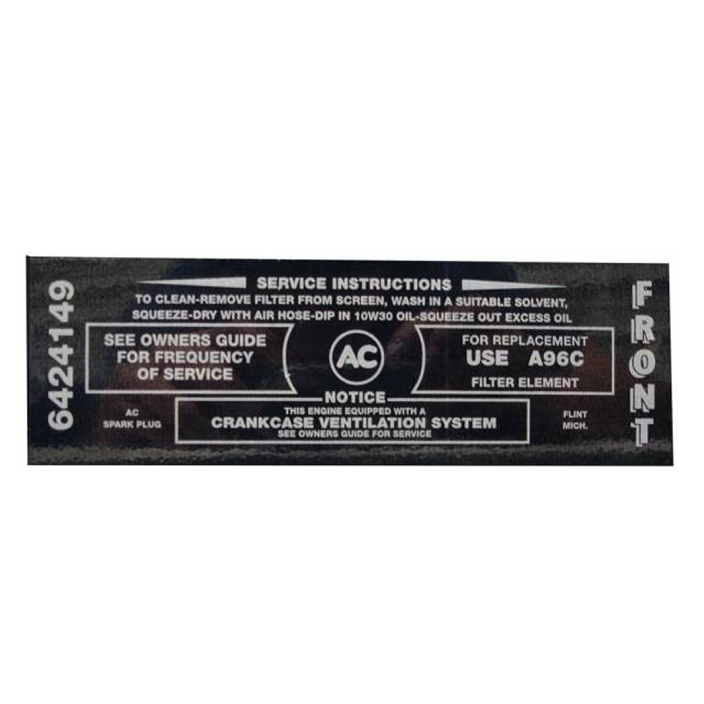 Air cleaner service instructions decal. Please note: decal is clear with white lettering. Shown on dark background for illustrational purposes only. Replaces original GM part #6424149. Add that final touch to your restoration. Top quality, officially licensed GM reproduction. Sold individually. MADE IN THE USA.