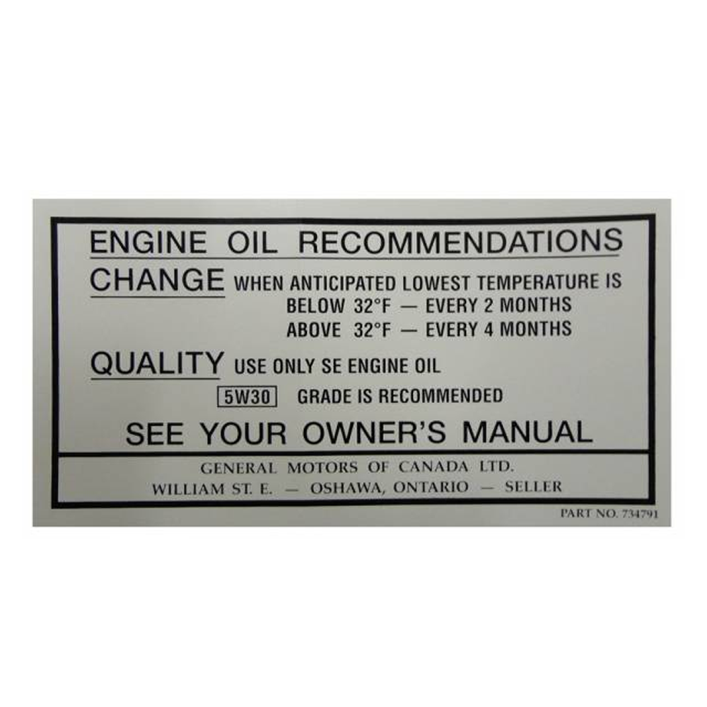 "Canada" oil change decal. Replaces original GM #734791. Add that final touch to your restoration. Top quality, officially licensed GM reproduction. MADE IN THE USA.
