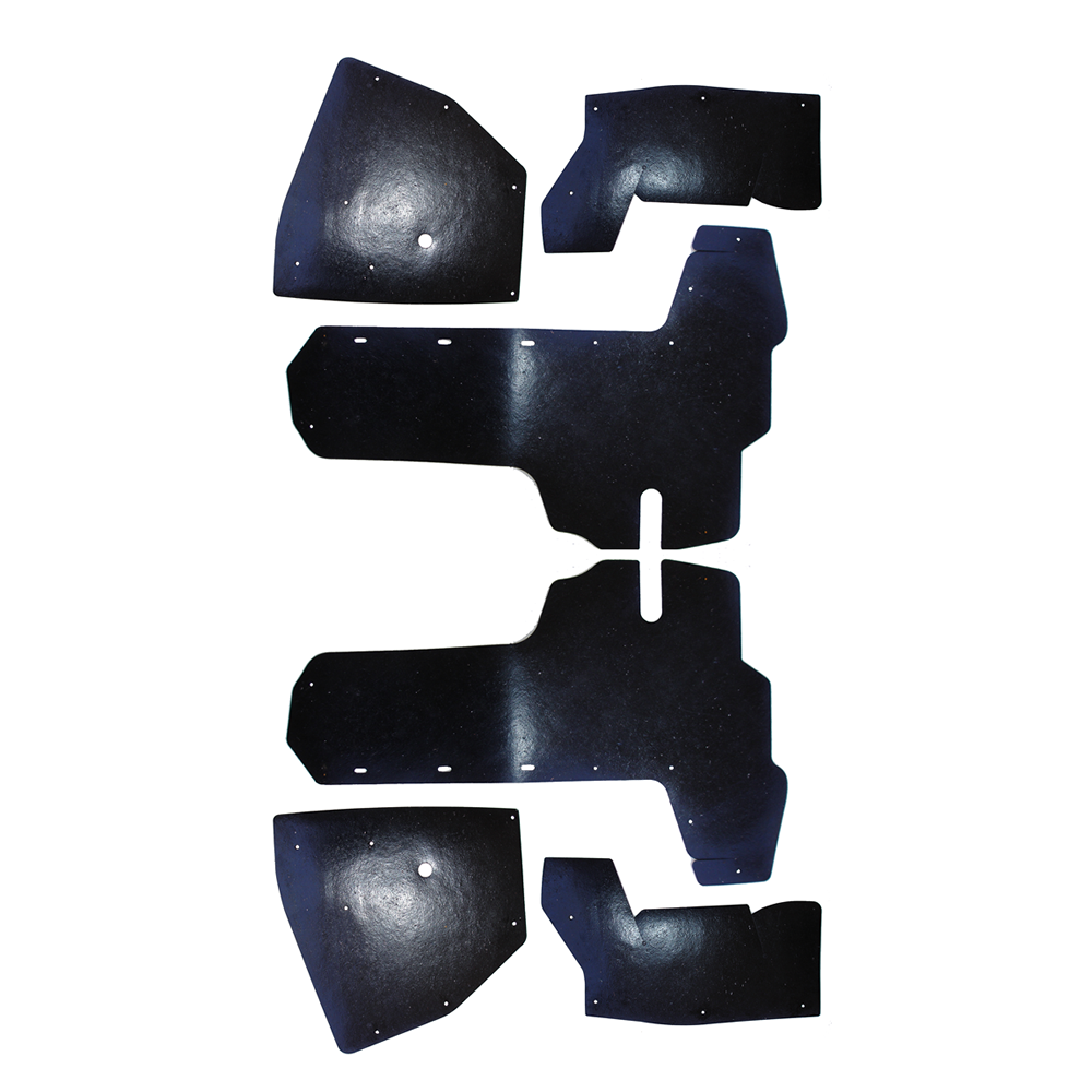 Splash apron / a arm dust shields. Die cut from original style masticated rubber for a factory fit. Pieces fit over a-arms and inside front inner fenders. 6 piece kit, installation fasteners included. MADE IN THE USA.