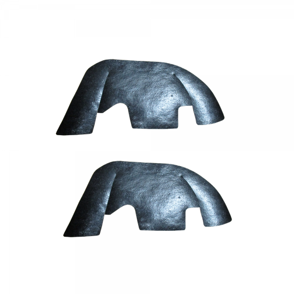 A Arm dust shields - pair LH & RH. Die cut from correct masticated rubber for a factory fit. Pieces fit over a arms inside front inner fenders to prevent weather & road debris from entering the engine compartment. Includes stainless steel install staples. Top quality, USA MADE to original specifications.