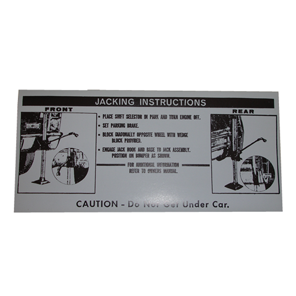 Jack instructions decal - in trunk. Typically found on underside of trunk lid. Replaces original GM part #1489537. Top quality GM licensed reproduction. Sold individually. MADE IN THE USA.