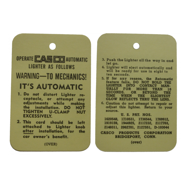 Cigarette lighter instructions tag. Top quality GM licensed reproduction. MADE IN THE USA.