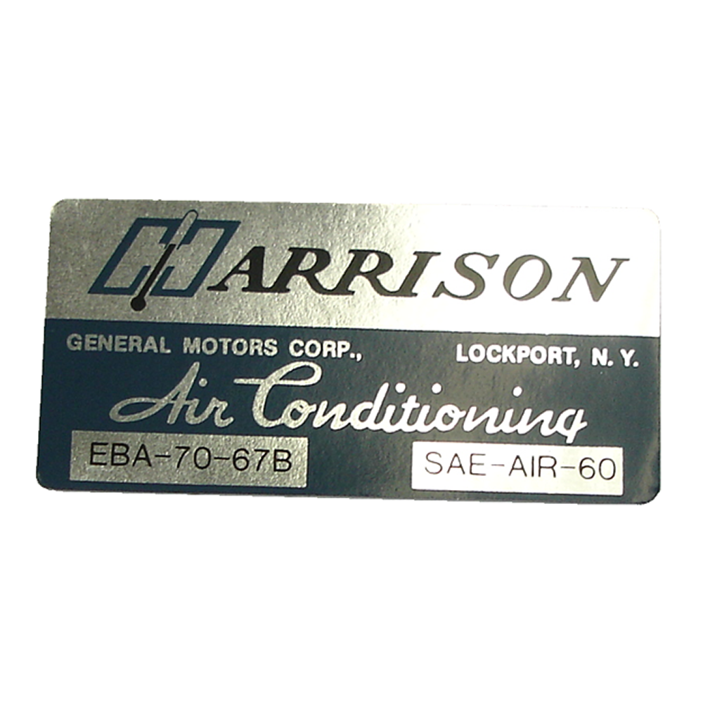 Air conditioner evaporator box decal - Harrison. Replaces original GM part #EBA7067B. Top quality GM licensed reproduction. Sold individually. MADE IN THE USA.
