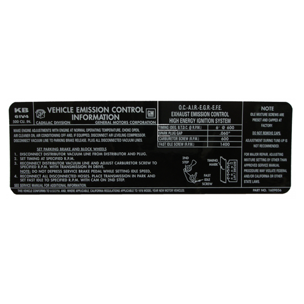 500 C.I. emissions decal - originally used on California cars only. Replaces original GM part #1609056. Top quality GM licensed reproduction. Sold individually. MADE IN THE USA.