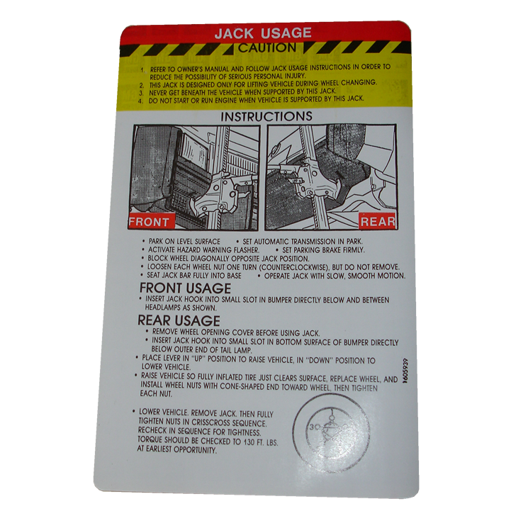 Jack instructions decal - in trunk. Typically found on underside of trunk lid. Replaces original GM part #1605939. Top quality GM licensed reproduction. Sold individually. MADE IN THE USA.