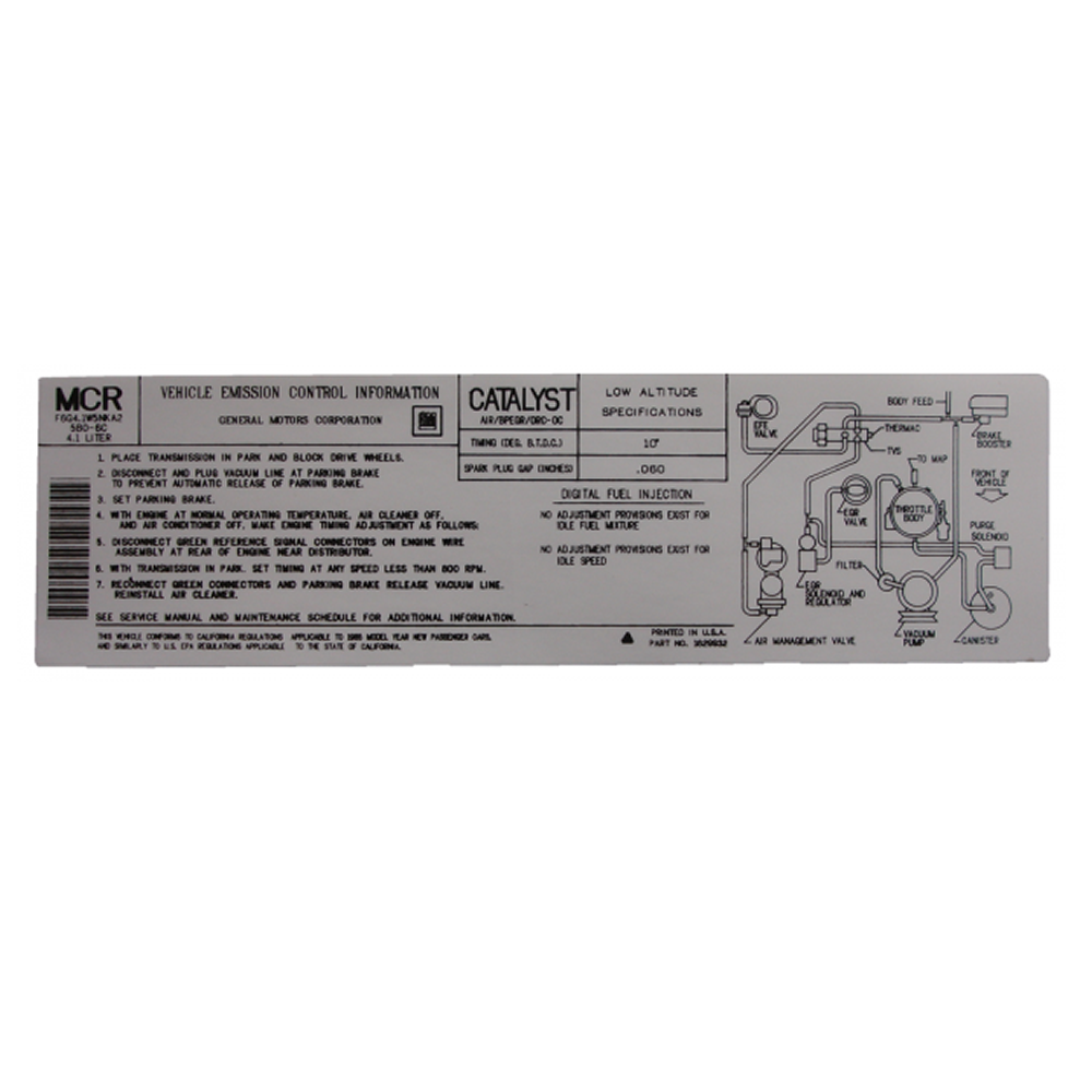 4.1 liter emissions decal - used on California cars. Replaces original GM part #1629932. Top quality GM licensed reproduction. Sold individually. MADE IN THE USA.