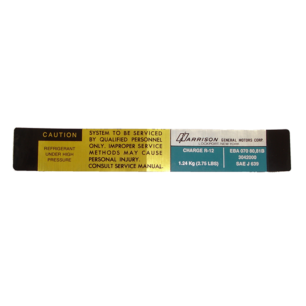 Air conditioner evaporator box decal - Harrison. Replaces original GM part #EBA0708081B. Top quality GM licensed reproduction. Sold individually. MADE IN THE USA.