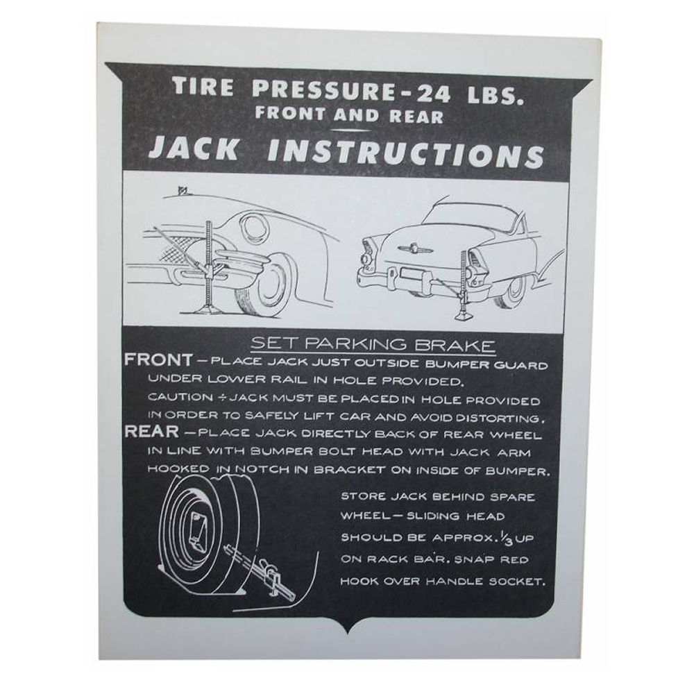 Jack instructions decal. Typically found on underside of trunk lid. Add that final touch to your restoration. Top quality, officially licensed GM reproduction. MADE IN THE USA.