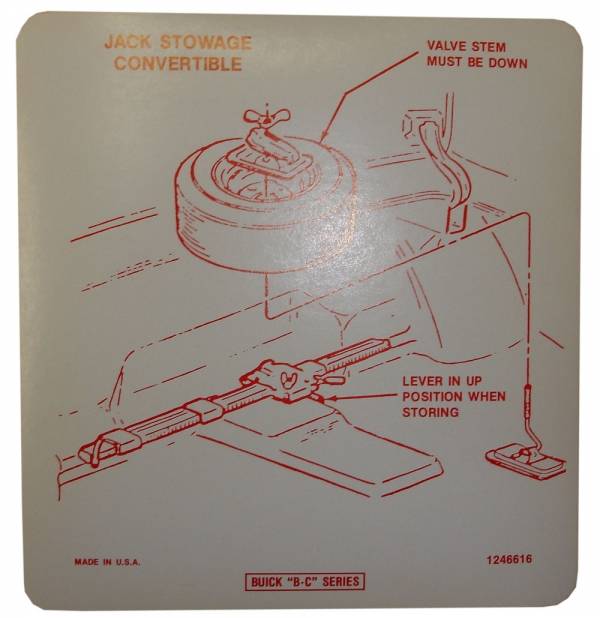 Tire stowage decal - for models with regular (non specialty) wheels. Typically found on underside of trunk lid. Replaces original GM part #1246616. Add that final touch to your restoration. Top quality, officially licensed GM reproduction. MADE IN THE USA.