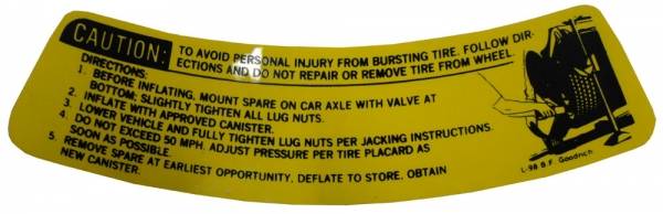 Space saver spare tire "caution" decal. Replaces original GM part #L-98. Add that final touch to your restoration. Top quality, officially licensed GM reproduction. MADE IN THE USA.
