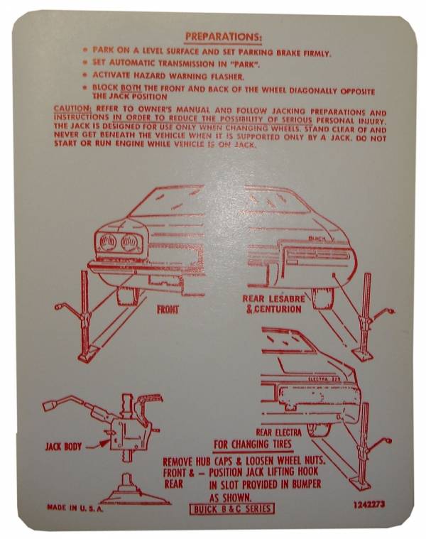 Jack instructions decal. Typically found on underside of trunk lid. Replaces original GM part #1242273. Add that final touch to your restoration. Top quality, officially licensed GM reproduction. MADE IN THE USA.