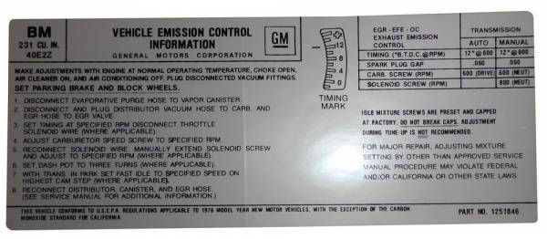 Automatic & manual transmission emission decal. Replaces original GM #1251846 (BM). Add that final touch to your restoration. Top quality, officially licensed GM reproduction. MADE IN THE USA.