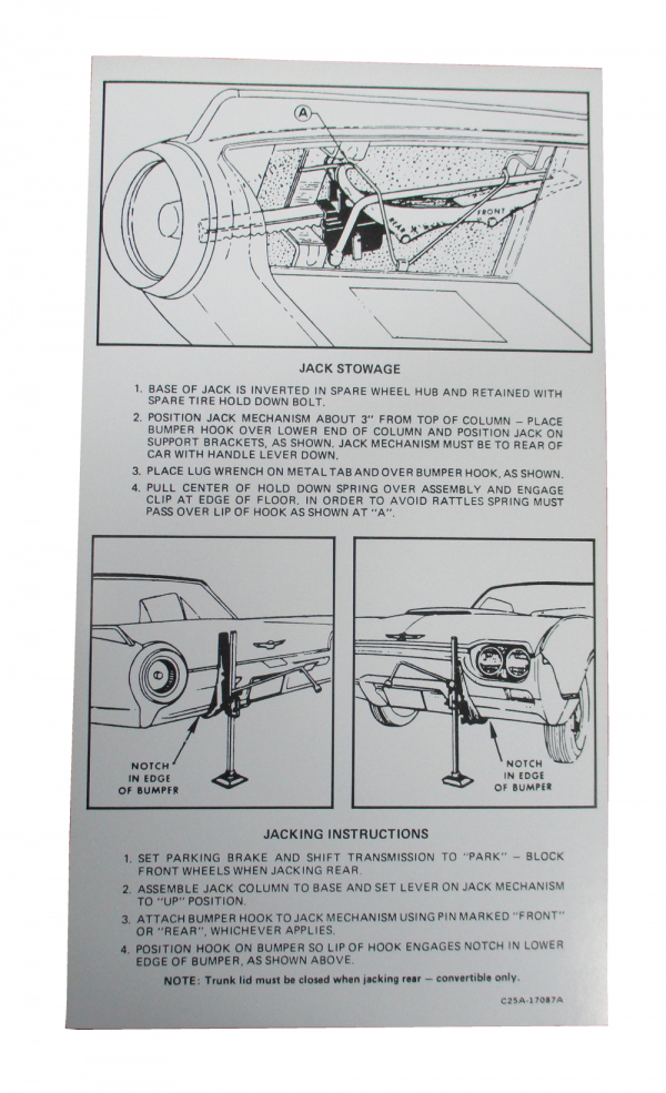 Jack instructions decal. Typically found on underside of trunk lid. Replaces original Ford part #C2SB-17087-A. Add that final touch to your restoration. Top quality, official Ford reproduction, MADE IN THE USA.
