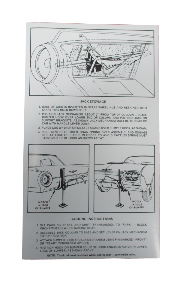 Jack instructions decal. Typically found on underside of trunk lid. Add that final touch to your restoration. Top quality, official Ford reproduction, MADE IN THE USA.