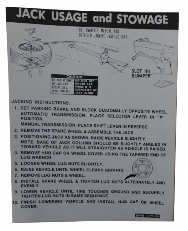 Jack instructions decal. Typically found on underside of trunk lid. Replaces original part # D4VB-BA. Add that final touch to your restoration. Top quality, licensed Lincoln decal. MADE IN THE USA.