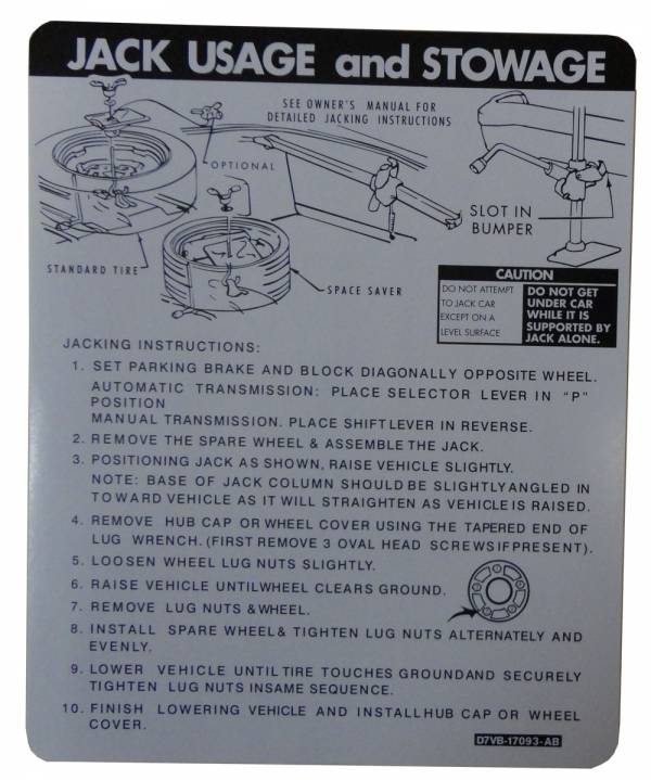 Jack instructions decal. Typically found on underside of trunk lid. Replaces original part # D7VB-17093-AB. Add that final touch to your restoration. Top quality, licensed Lincoln decal. MADE IN THE USA.