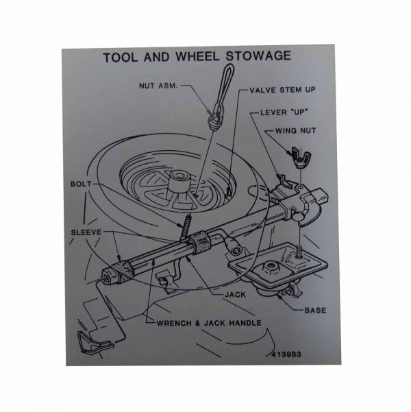 Spare tire stowage instructions decal - in trunk. For models with special wheels. Typically found on underside of trunk lid. Replaces original GM part #413983. Top quality GM licensed reproduction. Sold individually. MADE IN THE USA.