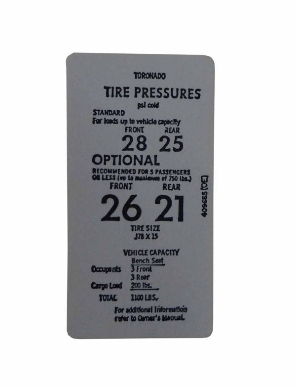 Tire pressure decal. Add that final touch to your restoration. Replaces original GM part #409665. Top quality, official GM reproduction, MADE IN THE USA.