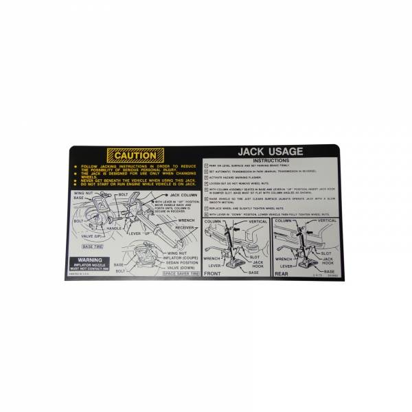 Jack instructions decal. Typically found on underside of trunk lid. Replaces original GM part #341042. Top quality, official GM reproduction, MADE IN THE USA.