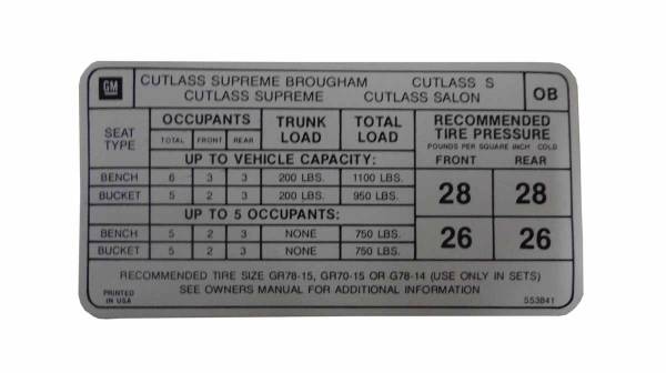 Tire pressure decal. Add that final touch to your restoration. Replaces original GM part #553841. Top quality, officially licensed GM product, MADE IN THE USA.