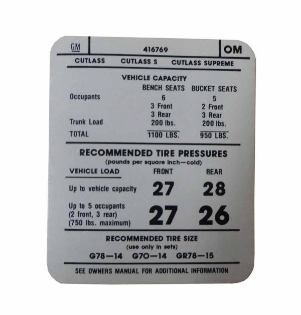 Tire pressure decal. Add that final touch to your restoration. Replaces original GM part #OM416769. Top quality, officially licensed GM product, MADE IN THE USA.