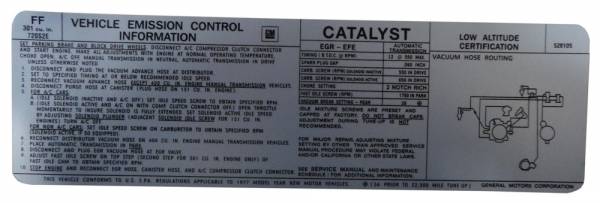 301 emission decal. Replaces original GM part #FF 528105. Add that final touch to your restoration. Top quality, officially licensed GM reproduction. MADE IN THE USA.