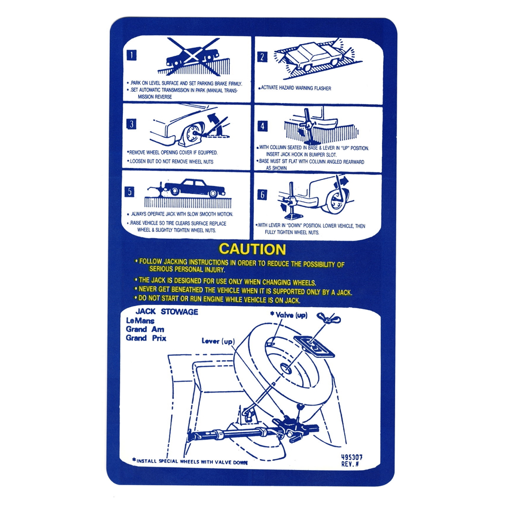 Jack instructions decal. Nothing adds that final touch like the proper decals. Our American Made reproductions will make your car stand out!