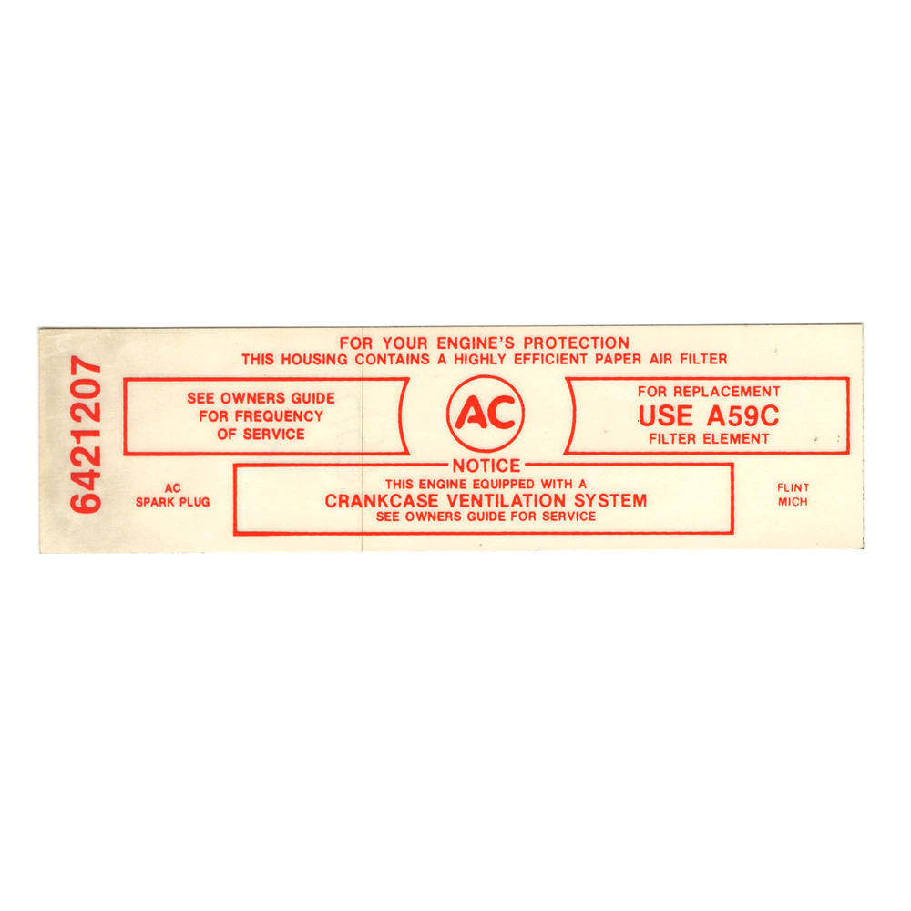 Air Cleaner Service Instructions Decal. Nothing adds that final touch like the proper decals. Our American Made reproductions will make your car stand out!